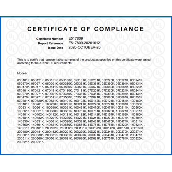 Agency Approvals Of The Disc Metal Oxide Varistor 05D270K